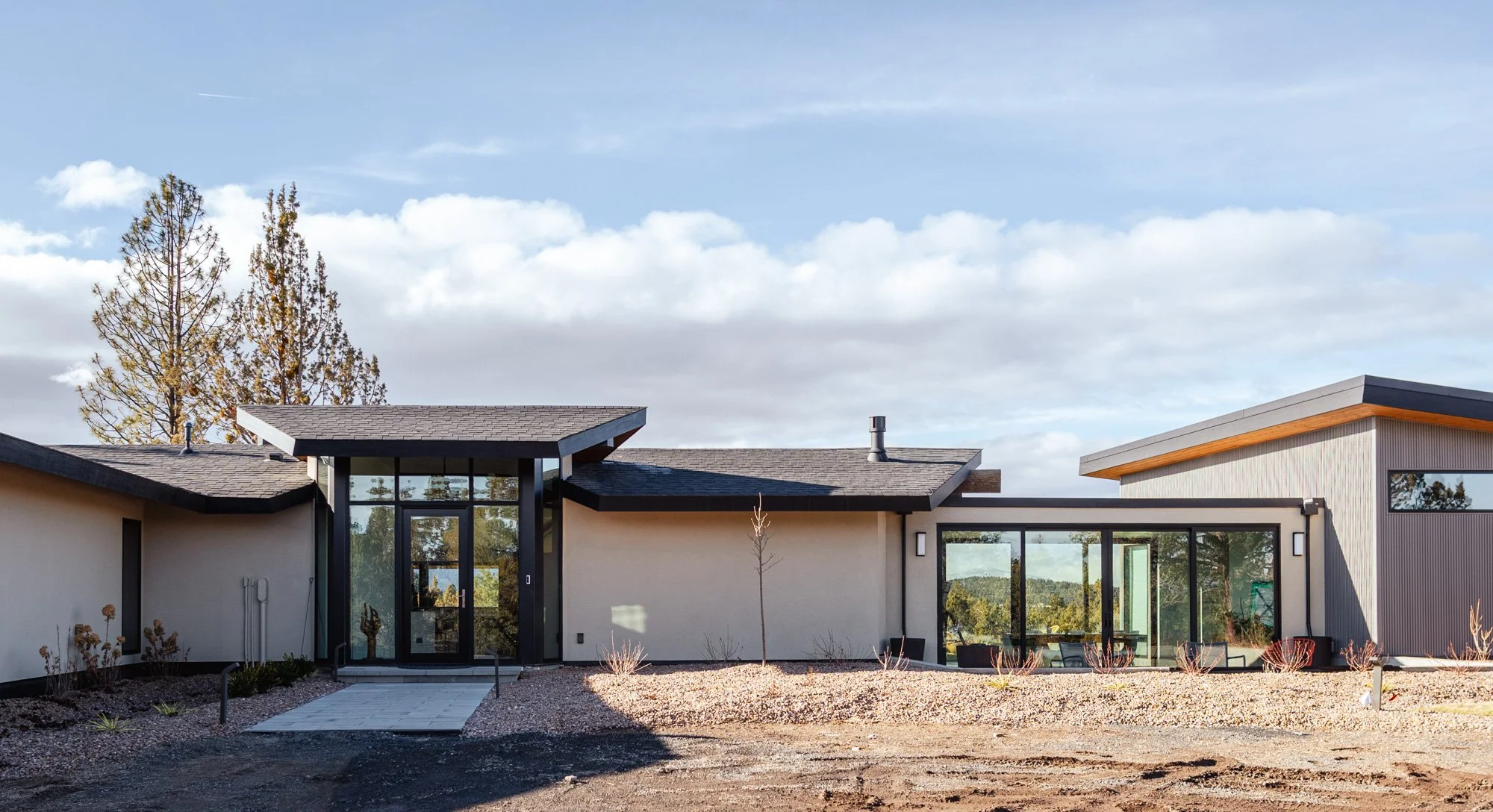 The softer, organic form of the existing home contrasts with the streamlined, mountain-industrial aesthetic of the additions. Both are clad in durable fire- and weather-resistant materials: stucco on the existing, and aluminum on the new. Landscape design further complements the home, providing a variety of spaces and true indoor–outdoor living.